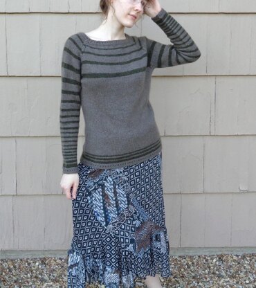 Knit top down with ragland sleeves, waist shaping, and stripes.