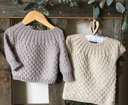 YARN: Long Sleeve Jumper: Valley Yarns ‘Valley Superwash DK, 100 % Extrafine Merino’, Colour 025 Light Grey. 50 grams = 137 yards / 125m. Short Sleeve: Debbie Bliss ‘Piper’ (50% cotton, 50% viscose) Colour 12004. 100 grams = 200m/218 yards.