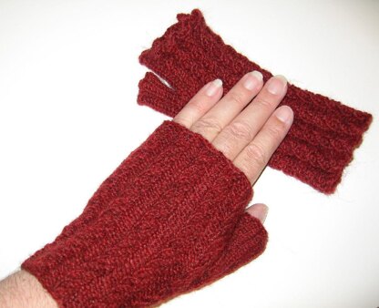 I designed this pattern with I got the fingerless gloves and lacy tam bug. There may be no cure for me. By this time, I figured out that most fingerless gloves feel nicer on your hand if you do a rib pattern across the palm. They fit more sizes of hands. I love this right twist pattern, I just changed it a little and did it over three stitches, and it looks like little cables going up the back of the hand. The tam is just a yarn over moving in a spiral around the tam. A very easy pattern.