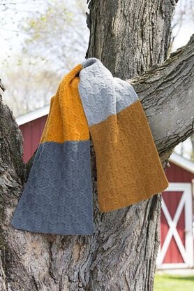 Four colors, pick your favorite combination, make up this cabled wrap. The yarn used makes the finished piece feel almost felted, but still lets the cables stand out.