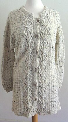 This is a wonderful cardigan that has a beautiful cable pattern worked on both sides of the front. It also has a basket-weave pattern worked all over the rest of the body and sleeves. The cardigan has modified drop shoulder sleeves and crew neckline. The front is closed with buttons.