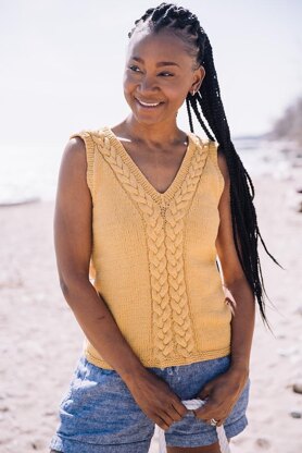 Cora is a beautiful stockinette stitch tank top with a wonderful cable pattern worked in front into a V-neck and continues to the shoulders. Knit in a sunny yellow, this is the tank that will kick off your summer knitting in a bright way.