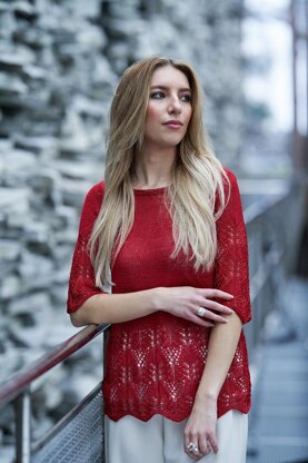 Yarn: The Handweavers Studio, Como Silk 4.5nm (100% Silk, 100 g, 350 m/382 yds). Sample is knitted in Poppy Red: 4 (4, 5, 5, 6, 6, 6, 7, 7) spools; 1278 (1404, 1530, 1656, 1831, 1957, 2083, 2209, 2335) m.