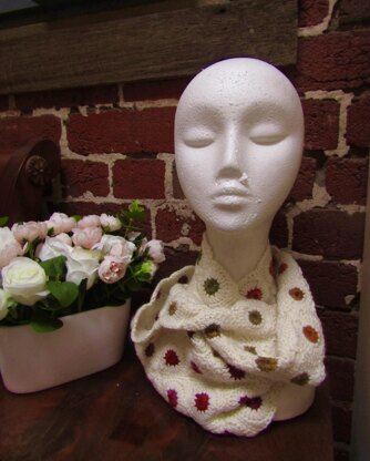 This is a great crochet project for the crochet worker with a little experience. So long as you can read a pattern and have made granny square you should manage this neck warmer without difficulty. It is made from 84 small squares which start off as rounds and have a beautiful pop of colour in the centre. It is sewn together but equally you could use Double Crochet to join the squares. I used the beautiful Noro Saiun 8ply for the centres but any 8 ply would be fine. A lovely warm accessory for Winter.
