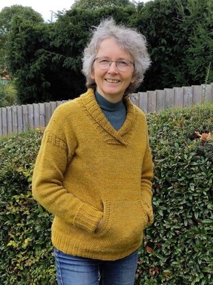 This cosy jumper is knitted in the round from the bottom up. After working a broken rib, stitches are created for the pocket lining which is worked using double-layered knitting. The pocket is completed and joined back into the body. The jumper is worked without shaping to the underarms then divided for front and back which are knitted flat and joined at the shoulders with three-needle bind off after some short row shaping. Drop shoulder sleeves are knitted top down and finished with a long cuff with a thumb hole. The neck is completed with a large, ribbed shawl collar. There is one small bit of sewing to complete the collar. The broken rib is echoed at the sides of the pocket openings and the top of the sleeves.