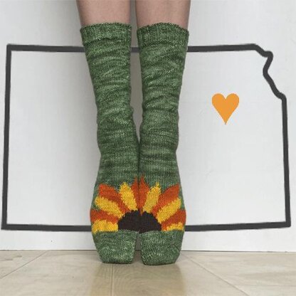 Sunflowers were the popular suggestion for Kansas, followed by the Flint Hills, farm life, and the Wizard of Oz. These socks are worked flat instep to the top of the foot bend, then in the round through the cuff. The sole is added last and is worked in the round.