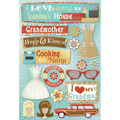KAREN FOSTER-Classic Grandma. Add some sweet sentiments to your paper crafting project with these cardstock stickers. They feature various imagery and phrases that will help you capture your memories with grandma. This 5-1/2x9 inch sheet contains seventeen stickers that vary in individual size. Acid and lignin free. Archival quality. Made in USA.