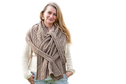 An interesting scarf/shawl that looks great knitted with an Aran weight tweed yarn. The stitch pattern on the scarf’s center is surrounded by two small cable stitch borders which partly form a cable sling that avoids slipping off the shoulder.