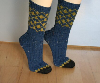 Karoso is a unisex sock pattern. The socks are knitted from the cuff down. After the colorwork part we work a broken rib pattern. The ribbed heel flap fits well. Before you start your toes, the colorwork pattern is picked up again and we change the color for the classic toes. This pattern is written to work on DPNs. You can easily adjust it for working on long circular needles. Enjoy it!