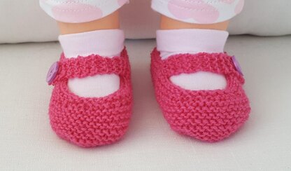 These 4ply Mary Jane style baby shoes are knitted in garter stitch and have a buttoned foot strap. This style of Shoe is also available in 3ply and 8ply.