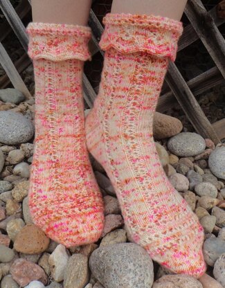 My inspiration for these sock was the Firefly episode, “Shindig” where Kaylee wears an over the top dress to a fancy party. The dress is epic, very antebellum southern belle. I've also designed Kaylee's Shindig Shawl to match.