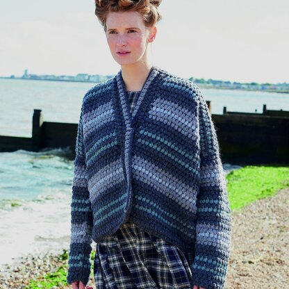 KEELA is a fab jacket design worked in Felted Tweed Aran from Marie's WINTER CROCHET collection. The resulting garment is quite heavy and therefore only suitable for outdoor wear. One of the colours is actually two ends of normal Felted Tweed worked together as unfortunately a lot of the original colours of the Felted Tweed Aran range have been discontinued by Rowan. Fastened with a pin or a brooch, the ‘throw on’ style makes this design very wearable.