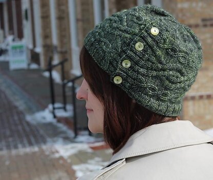 The hat is worked with an unusual construction: first, the cabled band is started with a provisional cast-on. Buttonbands are picked up from the top and bottom when the cable is complete. Then stitches are picked up from the sides for the bottom ribbing and the stockinette stitch crown.