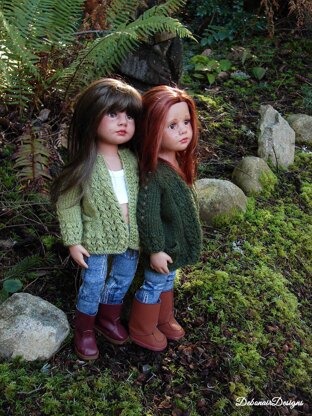 'Kelby' ~ an open front cardigan with two optional lengths both featuring a graceful lace stitch mimicking the gentle ripples of a fresh spring fountain, that is both easy on the needles and stylish for our dolls