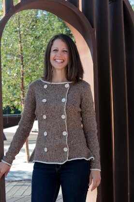 The jacket is knit from the bottom up with set-in sleeves that are knit in the round from the bottom up and sewn in later. The piece is finished off with an applied I-cord edging around the body, neck and cuffs. The pattern contains a photo tutorial for the applied I-cord edging.