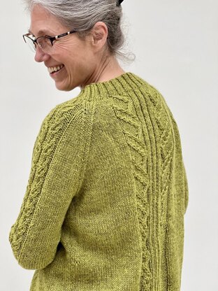 The delicate cable pattern on the Kew Gardens cardigan features leaf motifs which gradually enlarge in size from the lower edge to the upper body. The pattern panel is worked on a reverse stocking stitch background on either side of the front band. The leaf pattern panels are also worked in the centre of the garment back, and a little leaf motif runs up the centre of the sleeves.