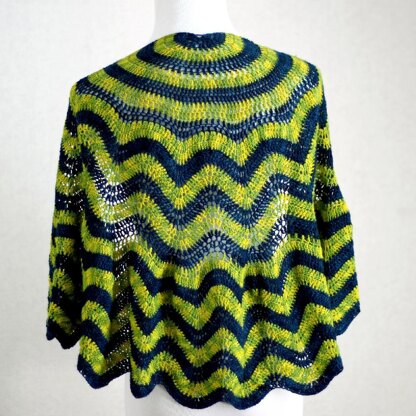 Key Lime Pi is an easy half-circle shawl crocheted from the neck-down. The ripple pattern has both written and charted instructions. This shawl is worked in two colors of fingering weight yarn. The high- contrast stripe pattern really shows off the ripple, though using one multi-colored yarn throughout would work equally well. Key Lime Pi is fast to crochet and is appropriate for beginners. There are 2 versions of the pattern, with US and UK terms. This pattern was tech edited by Chaitanya Muralidhara.