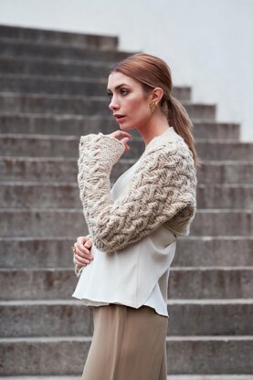 Voluminus hidden sand cables in a tweed mixture made of Rowan Lima (Bolivia) and Rowan Fine Tweed (Arncliffe), creates a divine texture for this shrug with bell cu s worked sideways in one piece. You begin at one cuff and shape it in the round until the back where it is worked at until the opposite sleeve. Why not lengthen the back by adding a loose back piece attached with an earring or a brooch? Make a loose reversible Keya scarf and use it as a collar for the shrug; named Keya after the bloom of a flower.