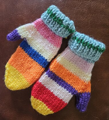 Are you looking to make mittens without the hassle of double pointed needles? Well, here it is! These are made on 2 needles, very easy to knit too! Fits children 2 to 9 yrs. A good selection of sizes! Use your scrap yarns and add stripes if you wish. We love the easy in working with this pattern, and they knit up so fast, you can make them for all your children and the neighbor kids too! A customer told us, she knits these up in bright colors, puts the mittens in a bag, and places the bag on the front door knob of her neighbors house on Christmas morning, where children live. They are so surprised to see someone left some cozy mittens on their door, and it is good for children to know someone in the neighborhood cares! Use worsted weight yarns, knitting needles, US # 7. Make these in sets of 3 mittens, as children tend to lose a mitten. Mittens fit either hand, so there is no left or right side one.