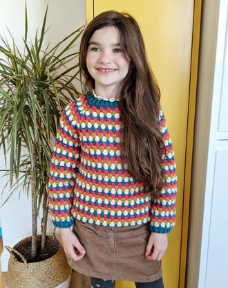 The Kids Granny Go Round Jumper is top down, seamless and fun! Worked in the classic granny stitch and available in 5 sizes -with easily customisable sleeve and body length. This is the Kids version of the adults Granny Go Round Jumper.