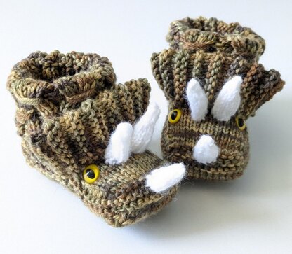 These slippers are worked flat on straight needles, with short rows and picked up stitches. The horn details are knit in the round on Double Point needles. I use a small US #4 needle to create a strudier fabric than usual for DK weight yarn. The slipper has a fold over double layered ankle. It uses one EASY cable stitch to create texture. This pattern requires sewing the back seam of the slipper together and attaching the Dino details.