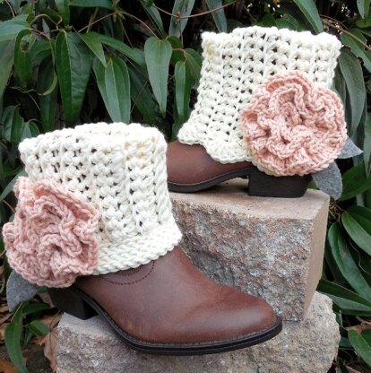 These boot cuffs are finished with a shell edging on one end and a tailored, slip stitch border on the other. Worked side to side, they have a comfortable stretch and are easy to customize for a perfect fit. The romantic, ruffled rose is the perfect accessory!