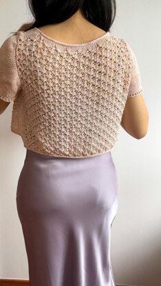 This cardigan is knit from the top down. The back is worked flat, and stitches are then picked up for shoulder shaping before transitioning into the front panels. Side seams join the front and back panels together. Sleeves are knit in the round from picked-up stitches, with short-row shaping to form the sleeve cap. An i-cord edge finishes the collar, front, and hem while a simple lace edge completes the sleeves.