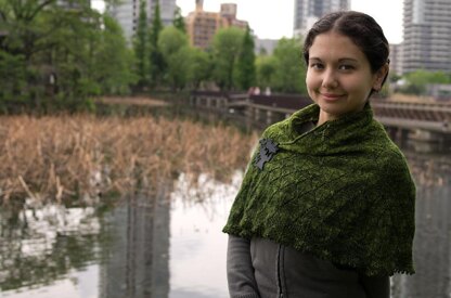 The shawl is knit from the top down starting with a tab cast on. The petal like diamonds grow from the center of the shawl and grow outwards. They are bordered at the edge by twisted rib leaves and a mesh pattern. The edge is a picot cast off. The border of the shawl is formed by knitting in reverse stockinette which naturally forms a rolled edge.