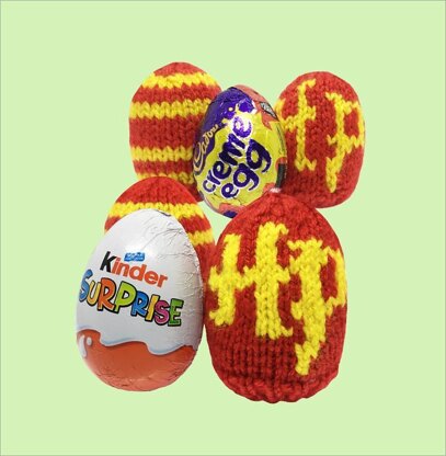 4 PATTERNS FOR COSIES/HOLDERS DESIGNED TO FIT KINDER SURPRISE AND CREAM EGGS.