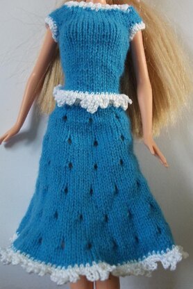 A pretty suit for Barbie. Uses 2mm needles and 2ply lace weight wool The pretty crochet trim is very easy to do.