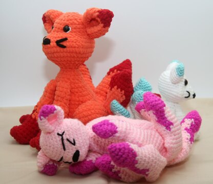 This pattern uses continuous rounds and invisible decreases. For the sitting version, you need to sew the back legs, ears, and tails. For the sleeping version, you'll need to sew all legs, ears, and tails. There is a lot of color changing involved unless you choose to only do one color. For the sleeping version, it does use short rounds.