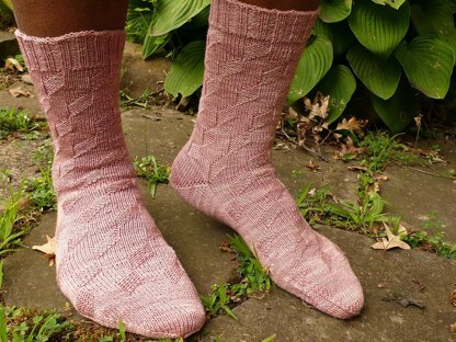 This top-down unisex sock in four sizes features a knit/purl motif which is enhanced by using a yarn that has a bit of sheen. Knits and purls are arranged in the motif to wind up the foot and leg like kites or ribbons in the wind. Substituting yarn and/or needle size may result in an overall variation in sock size. May be reversed for toe-up construction.