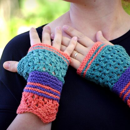 PATTERN NOTES These fingerless mittens are worked in the round from the bottom up using three colors of DK weight yarn. The lace patterns are both charted and written out.