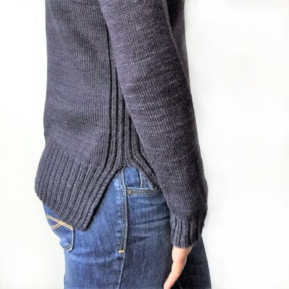 The Knife Grinder’s Daughter is knit from the bottom up in the round. A continuous stripe of ribbing runs from the side hems up the body and down the sleeves to the wrists.