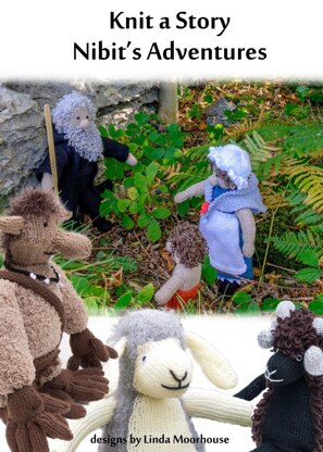 The pattern includes: Nibit who is 7.5 inches tall; his shorts; rucksack; rope; rustic bread & cheese; water carrier; napkin & cloak. Nibit's mother who is 13 inches tall; dress; pants; mop cap; shawl; underskirt. Wiseman (Wizard) who is 15 inches tall; trousers; tunic; long coat with hood. Troll - 13 inches tall Big Fella, the Hebridian sheep - 9.5 inches tall (sitting) Herdie, the Herdwick sheep - 9.5 inches tall (sitting)