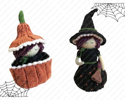 BEATRIX The Witch Queen in the picture was made of yarn weight 2.0, using 2.5 knitting needle. Finished Product Size: 15 cm/ 6 inches standing. Diameter of bottom cupcake is 5 cm/ 2 inches. Diameter of hat brim is 9 cm/ 3.5 inches.