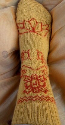 Description: This design is for advanced skill sock knitters. It is knit cuff down on two circular needles. The circulars are highly recommended due to the stranded intarsia motifs. Most of the sock is knit in the round with the exception of the leg which is knit flat, then seamed. Since the charts are challenging, the cuff, heel, gusset and toe are basic for peaceful kn