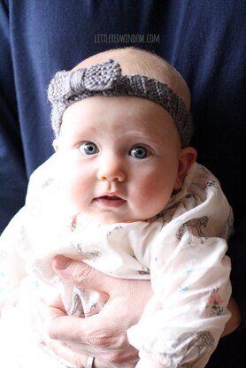 Knit this sweet little bow headband for your little one. The ribbed band is soft and comfy on their head and the bow is cute as can be. This pattern is worked in the round.