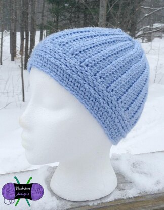 The Knit Illusions Skully is a tight fitting beanie with three different stitch patterns that all resemble knit fabric, but they’re actually crochet stitches!