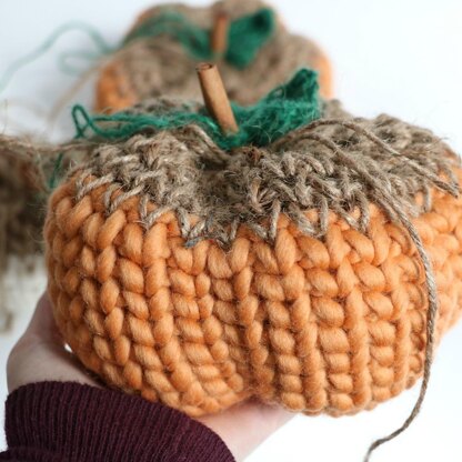 How to Crochet Knit Look Rustic Pumpkin. Pumpkin is filled with polyester fibrefill and scented with cinnamon. Super Bulky yarn and jute twine is used to create this unique rustic pumpkin. Pumpkin is worked in centre single crochet stitches for classic knit look stitch. Make 4 different sizes in various colours for festive home decor. Comes with a full video tutorial in size medium on our YouTube channel.