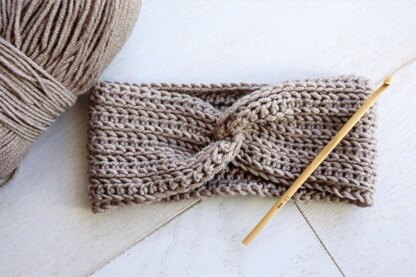 Believe it or not this headband is made using crochet! The knit-look is achieved with the special half double crochet stitch called the camel stitch. The turban twist front is deceptivly easy to achieve and conviently hides the unsightly seam!
