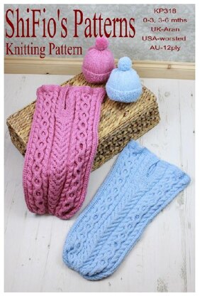 Sizes 2: 0-3mths 3-6mths Measurements: Width 26" (56cm) 30" (76cm) Length 22"(56cm) 28" (71cm) Knitting needles UK 4.5 mm, USA 7 Cable needle Materials:UK Aran, USA worsted (4), AU 10ply yarn 290g 370g Knitting needles UK 4.5 mm, USA 7 Cable needle