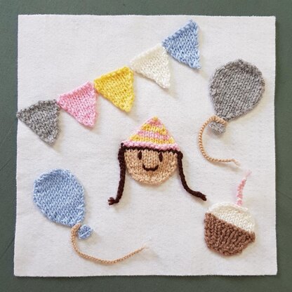 Made up of several knitted pieces placed in varying designs on a felt background. Includes knitted bunting pieces, knitted birthday cake piece, knitted smiley face with party hat, and knitted balloons. Balloon string, candle, bunting string and hair for the smiley face are all made with finger-knitted pieces.