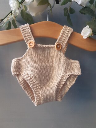 A knitting pattern to make a romper to fit a 14in doll, including a Dinkum doll. Image included to show how it sitson a stuffed Dinkum babygro for size guidance,