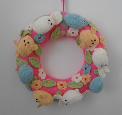 Knitting pattern for a lovely bright Easter wreath. The wreath is worked to fit over a polystyrene wreath form, with a knitted cover. Decorations are then applied by adding knitted eggs, bunnies and chicks, and crocheted flowers and leaves.