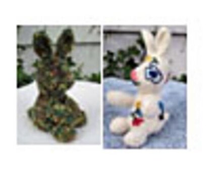 These are not your average, garden-variety rabbits! They are knit completely in the round on size US 8 double-pointed needles with wool yarn, then felted in your washing machine. Start at the bottom and knit your way to the top of the ears! No seams necessary! The only time you'll get out your needle and thread is to close up the hole on the bottom after stuffing. Try your hand at different embroidery stitches for the Tapestry Rabbit ... or hold a strand of wool together with a novelty yarn like Little Flowers for an "ivy-covered" rabbit like the Topiary. You could also use just plain, green yarn for the same effect. The 6-page pattern gives directions for knitting, felting and finishing. As always, send me an email if you run into any trouble spots! I hope you'll enjoy them!