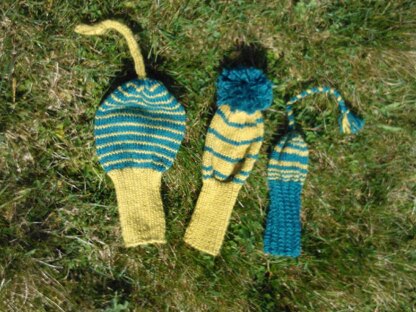 Knitting pattern for golf club covers. There are three different patterns and three different ribs, and three different sizes to mix and match for all golf clubs.