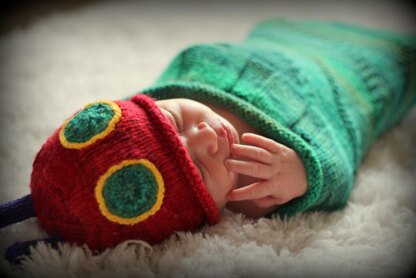 This is an adorable sleep sack and matching hat styled after the Hungry Caterpillar, perfect for newborn photo shoots.
