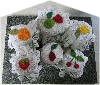 Materials required: one pair size 2 mm knitting needles, size 10 or size 12 crochet thread - 50 g white (this will make two of each size jar covers or five large jar covers), plus oddments of colours as required for individual fruits.