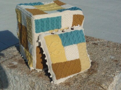Knitting pattern for lovely footstool, draught excluder, cushion and rug. All in the same textured patchwork pattern. The items are knitted in individual pieces, so you can vary the size to fit your own requirements.